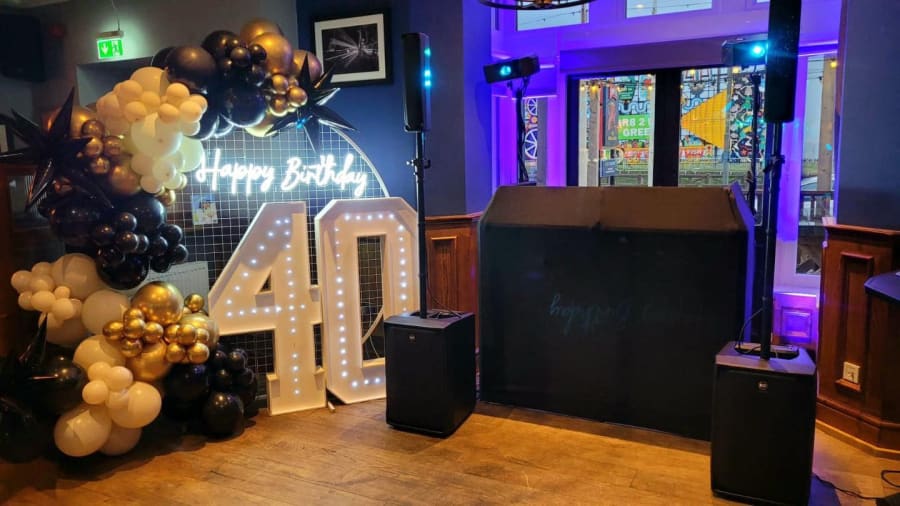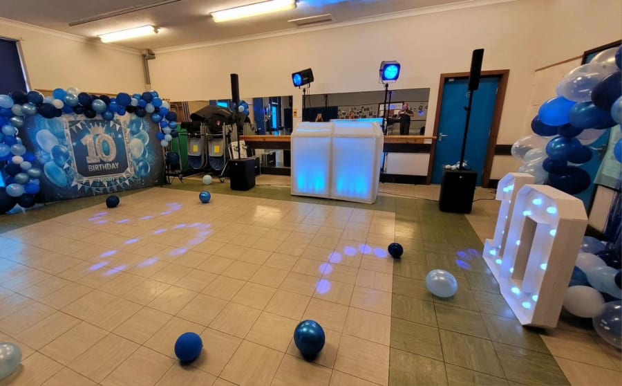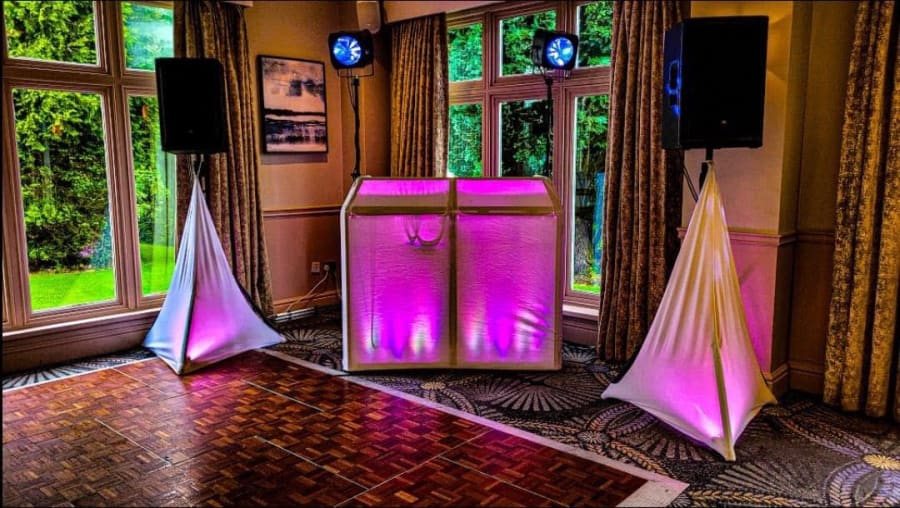 Our Classic DJ setup is our most popular when it comes to parties, whether its a Christening or Birthday celebration, this setup ticks all the boxes for look and and a venue which holds between 100 and 150 guests. Complete with front DJ booth which can be white or black, lighting effects and crisp sound system, your guests can dance the night away knowing you booked the best for your event. With the white DJ booth, lighting under the booth can be changed to match any colour scheme you may have for the event, or to add "mood" lighting" to help create atmosphere - every little detail is what we consider when it comes to supplying the best for your event.