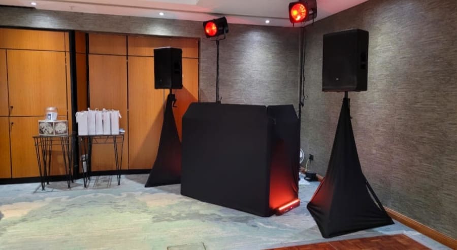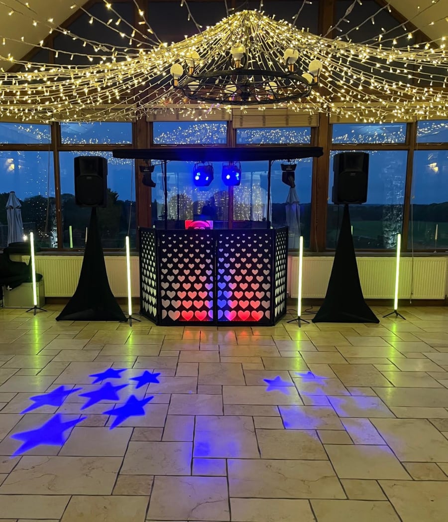 There is also the option to add on a star cloth front DJ booth (white or black) instead of a plain front for £30 extra or a 6m x 3m black led star cloth for behind the DJ setup for £225