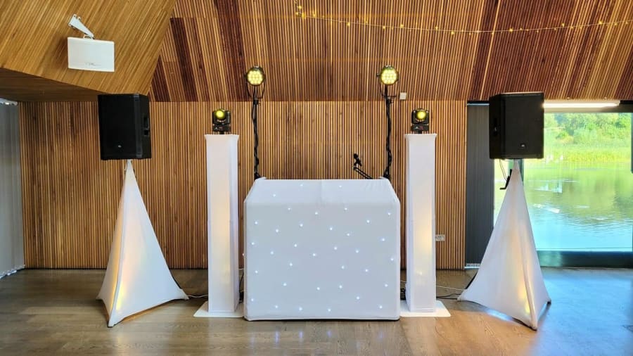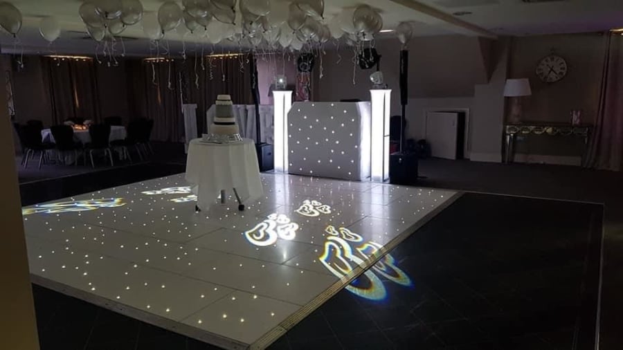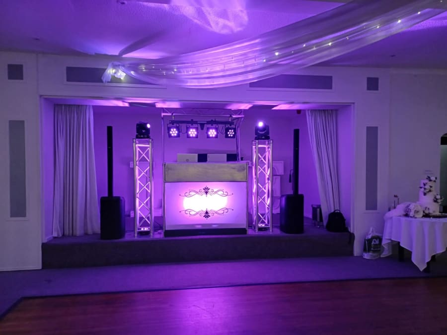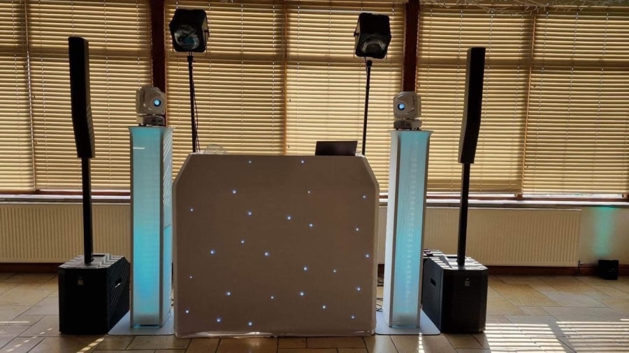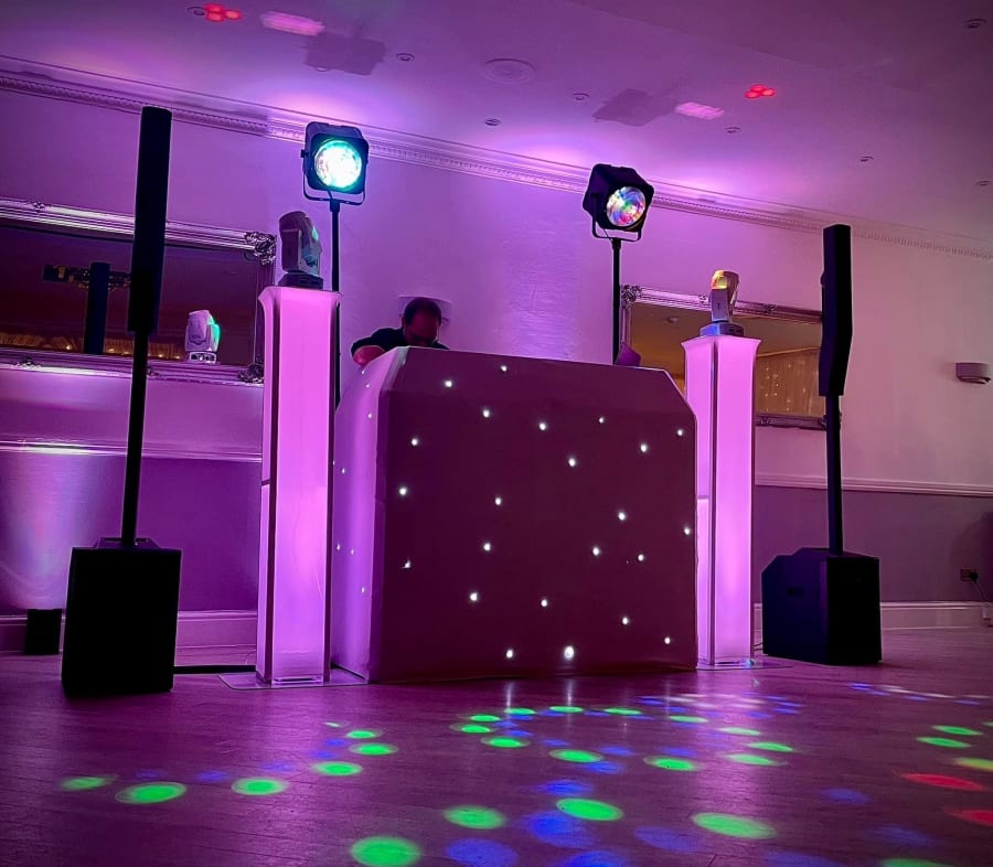 Our Enhanced DJ setup is for the designer event, when you have spent so much on the decoration of the venue that it is important that things like the DJ equipment also have the "dressed look". Complete with front DJ booth in white or black which is also starlit (fairylit) and can be static, twinkle or flash, professional sound system capable at handling rooms holding up to 300 guests, lighting effects to add atmosphere to the dancing area as well as 2 x up lit podiums for either side of the DJ booth. The podiums can be up lit in a colour to match your colour scheme, take a look through our photos to see examples, pink, purple, blue, white, yellow etc. The podiums also house some intelligent "moving head" lighting effects on top to add some more sophisticated lighting to your room.