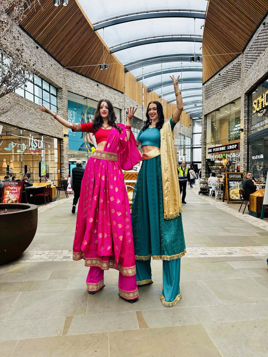 A pair of Diwali stilt walkers is from £600 plus vat and mileage for a 3 hour hire with 3 x 30mins performances during this duration