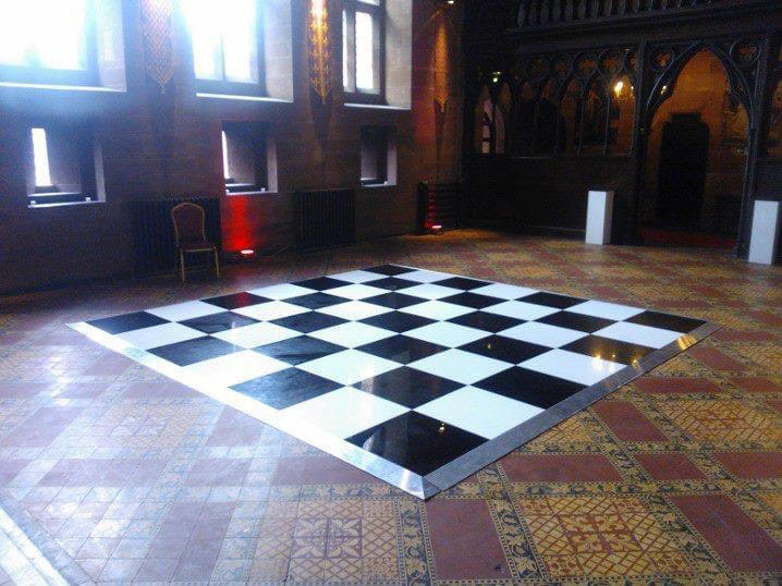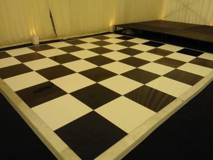 Our black and white chequered floors are delivered to your venue, cleaned, polished and at a time to suit you, installed and then collected at the end of the event. We offer small floors for house parties (minimum size 10ft x 10ft) up to a standard hire size of 14ft x 14ft or 16ft x 16ft which fits most function rooms and then right up to a 60ft floor for massive events!