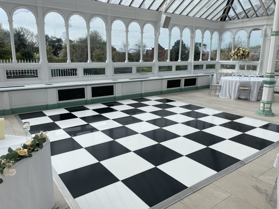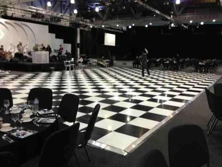 We stock a large amount of acrylic black and white chequered portable dance floor panels, perfect for creating a dance floor to suit any size of venue from 10ft x 10ft up to the largest floor we ever supplied, a 60ft x 40ft black and white chequered floor at the BT convention centre in Liverpool for a corporate event.