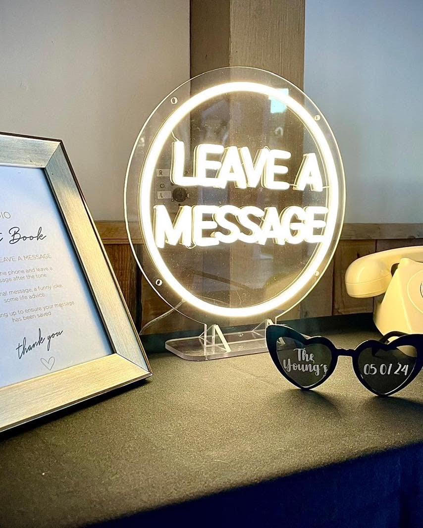 Our Audio Guest book provides memorable voice messages for year to come. Our old fashioned classic telephone complete with sign explaining to your guests what to do and neon sign, provides the perfect way for your guests to leave you messages at your special event.