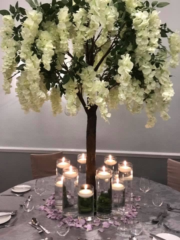 Priced at £50 per tree including wisteria round the base of the tree, tea lights and scatter petals for your table. Upgrade to add 6 x cylinder vases of 2 different heights with water and floating candles to go around the base of the tree for an additional £30 creating an amazing display.
