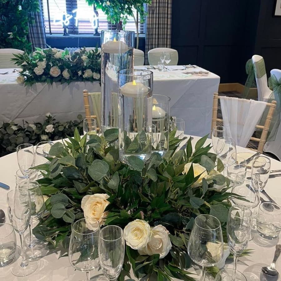 Choose from a set of 3 cylinder vases of different heights or wine glass cylinders (cylinders on stems) with floating candles and a generous helping of green foliage around the base of the vases and white and ivory florals.