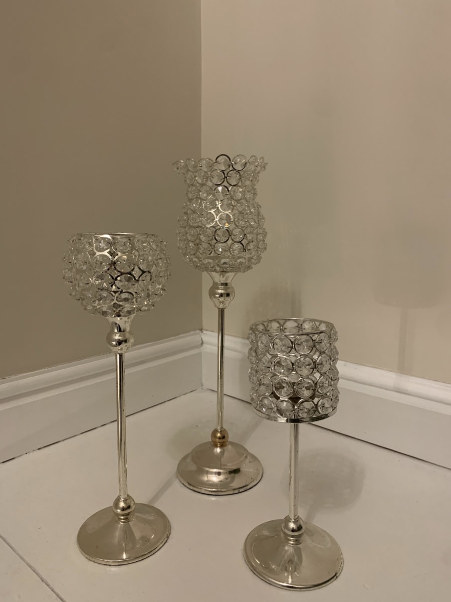 These small crystal goblets hold a tea light in each and are perfect for small intimate events or for smaller tables, where space is an issue. Perfect for all types of events from awards dinners to birthdays, weddings to Christmas parties. They are also available to hire as part of a bigger table centre piece and work well with our large crystal chandelier table centres, these go round the crystal chandelier nicely.