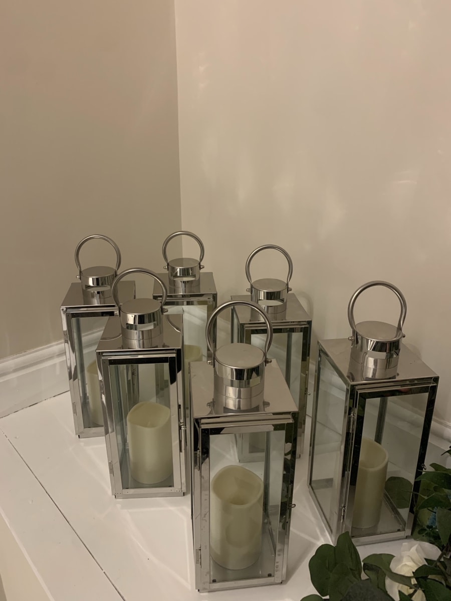 These small silver lanterns come complete with artificial candle and are approx. 30cm high by 14cm x 14cm and are priced at £60 for the 6 to hire. They are perfect for weddings for either the ceremony aisle, table centres or top table décor. They also work well on tall poseur tables and coffee top tables to add a little bit of décor around your chosen venue.