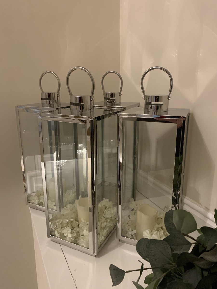 These over sized silver lanterns stand approx. 50cm tall by 30cm x 30cm and are brilliant as table centres, ceremony aisle décor for weddings, to stand in front of a registrars table or for other events like awards evenings and corporate events when having a red carpet entrance to help line the red carpet
