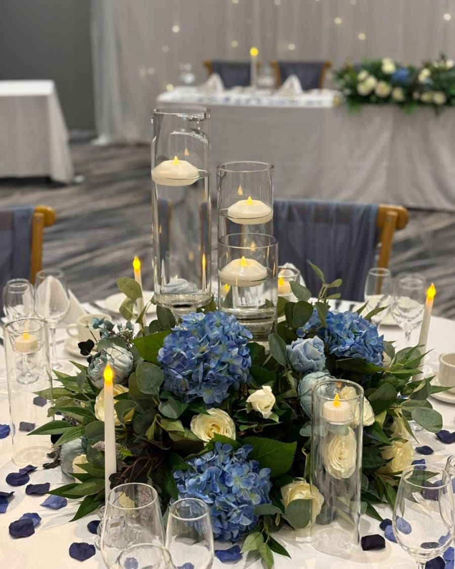 This table centre is one of our most popular and is available in many different colours. Choose from either 3 different heights of straight cylinder vases or our wine glass cylinders (on a stem) filled with water and with floating candles. The table centre is completed with green foliage and florals around the base of the vases. We can supply either real or artificial candles at no extra cost to accommodate all venues.