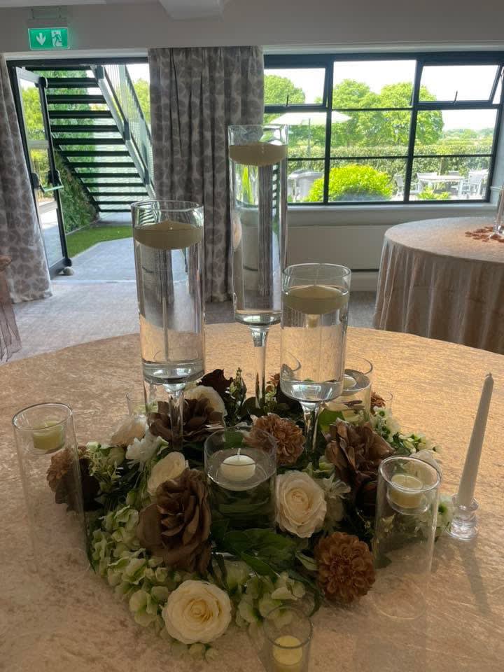 - Candle light package to go around the base of the table centre (3 x cylinders with floating candles, 3 x taper candle holders with taper candles, 3 x high tea light holders and 3 x low tea light holders with tea lights - additional £15
