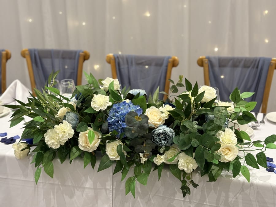 Our floral lengths come in 1 metre lengths and are oozing with green foliage and mixed with florals, here in whites and blues. These florals are perfect for weddings for either the registrars table, top table florals or to line a ceremony aisle. Priced to hire at only £30 per 1 metre