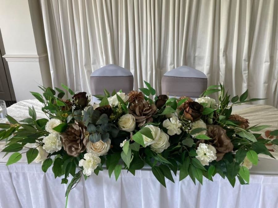 Our floral lengths come in 1 metre lengths and are oozing with green foliage and mixed with florals, here in browns, mocha and white. These florals are perfect for weddings for either the registrars table, top table florals or to line a ceremony aisle. Priced to hire at only £30 per 1 metre