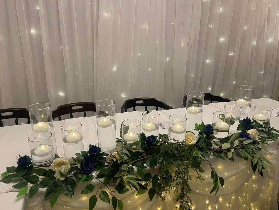 This is our more minimalistic top table foliage compared to our much more fuller range which we charge at £30 per metre. This is priced at £15 per metre and has a mix of green foliage and one colour of florals to match your chosen colour scheme, This look also comes with 6 x cylinders with floating candles per metre to stand behind the foliage as shown in the photo