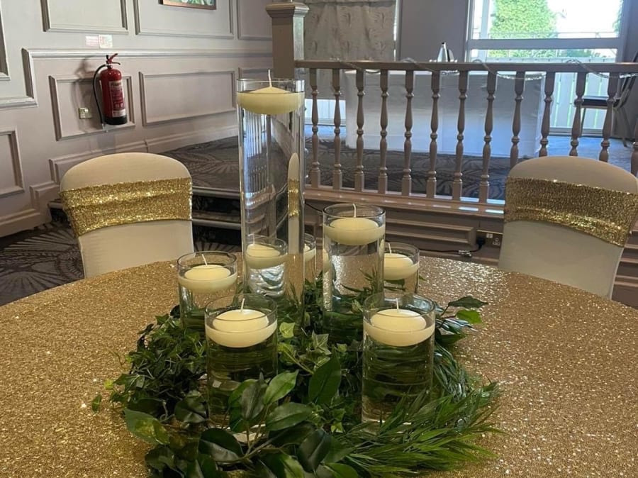 Included in the hire is 1 x large, 1 x medium and 5 x small cylinders filled with water and completed with floating candles. Finished off with greenery round the bottom of the vases and scatter petals on the table if required.