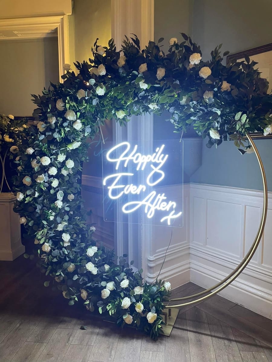 Packaged full of green foliage and whites/ivory flowers, it matches any colour scheme and looks great in any venue. Complete with the neon "happily ever after" sign hanging in the middle of the moonhgate and with nice gold frame on the side with no flowers, this moongate is simply stunning and a must have for your wedding.