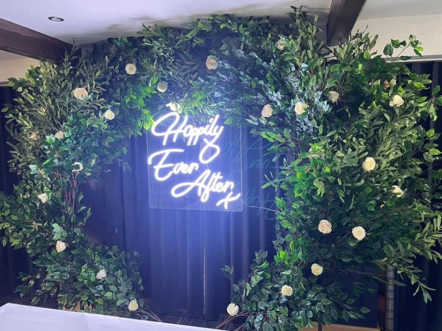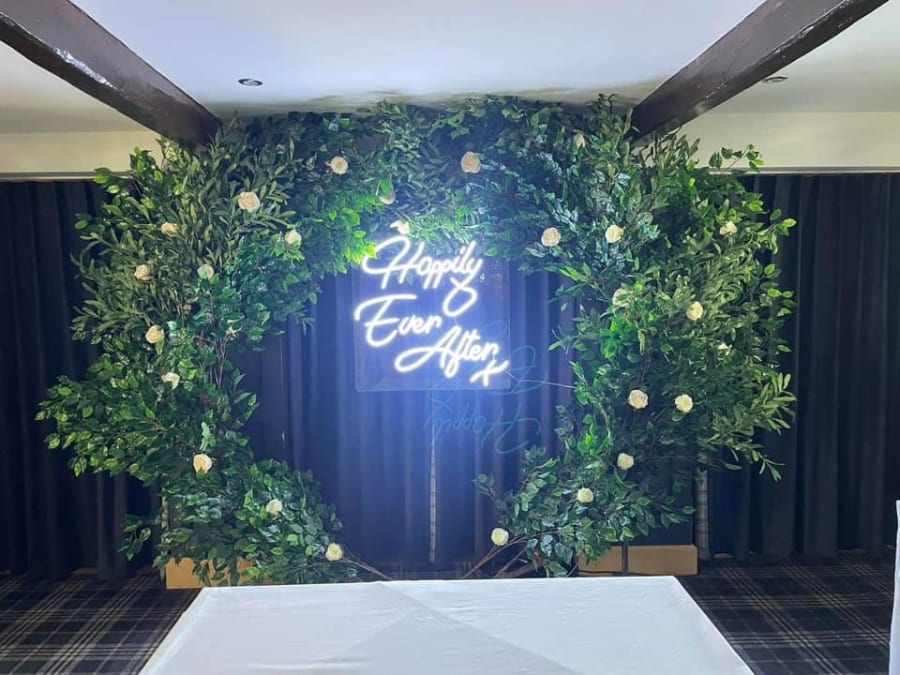 Our Moongate full of green foliage looks absolutely stunning for parties and weddings alike. Complete with or without neon sign to finish off the look, this fantastic moongate provides the perfect photo opportunity and venue decoration for your venue.