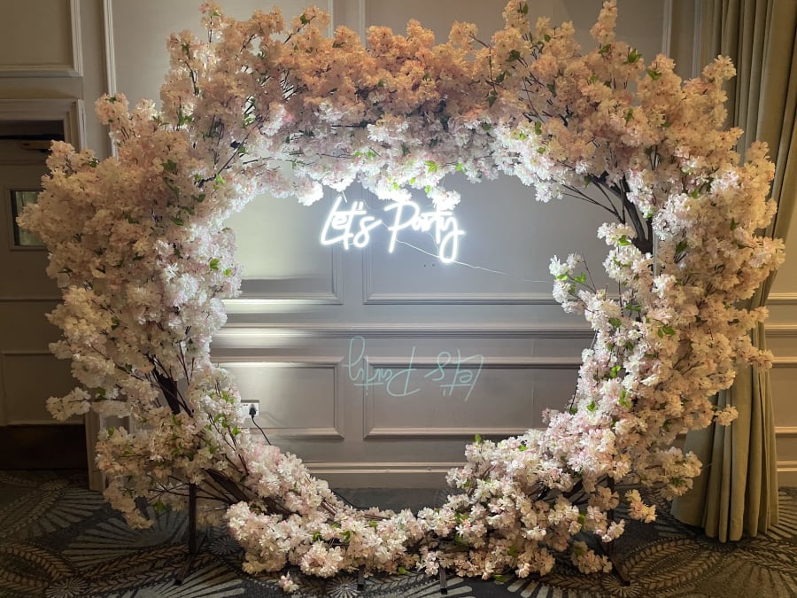 Create a stunning focal point with our Pink Blossom Hoop for hire at weddings and events in Lancashire, Cheshire, Manchester and the Northwest. Our Pink Blossom Hoop looks fantastic in many different setup locations including;