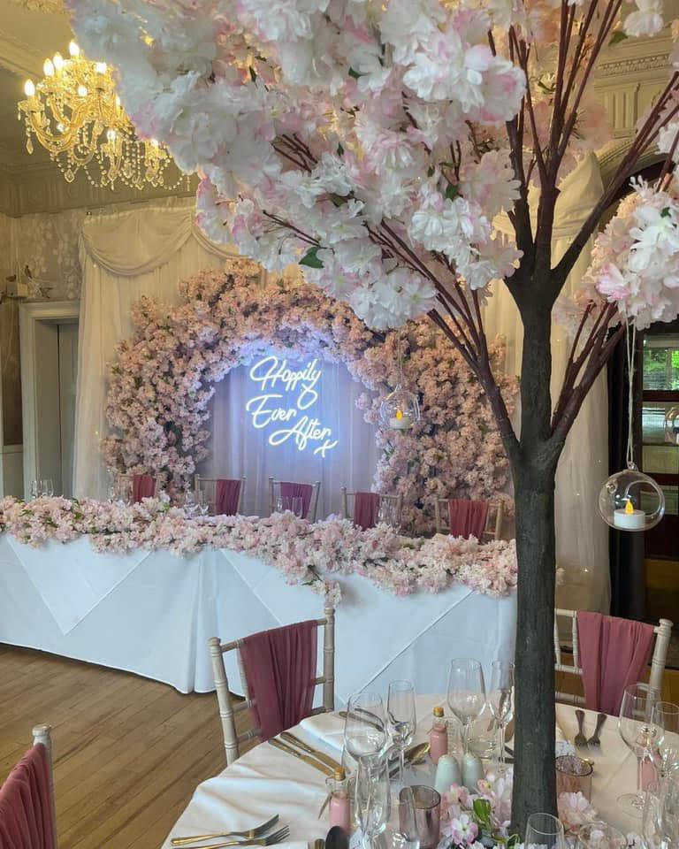 Ask our team about our matching 1.8m pink blossom trees and pink blossom top table front to create the finishing touches. Call our team on 01257 267 222