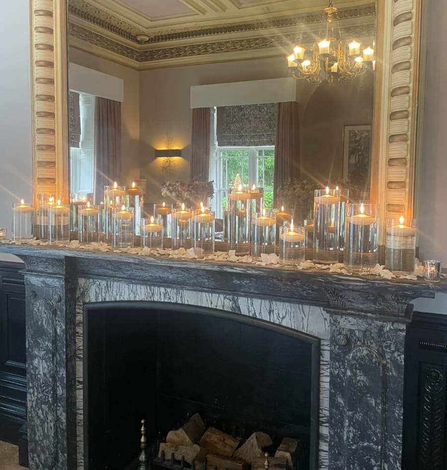 This stunning display adds the perfect candle light to any event. Either used on a side board, fire place or even a wedding top table - the display is breath taking and stunning! The display is made up of 24 cylinders of 2 different heights, our medium cylinder vase, small cylinder and wider small cylinder to give the perfect look. Finished off with a huge sprinkling of petals for round the vases this is the perfect add on to any event.